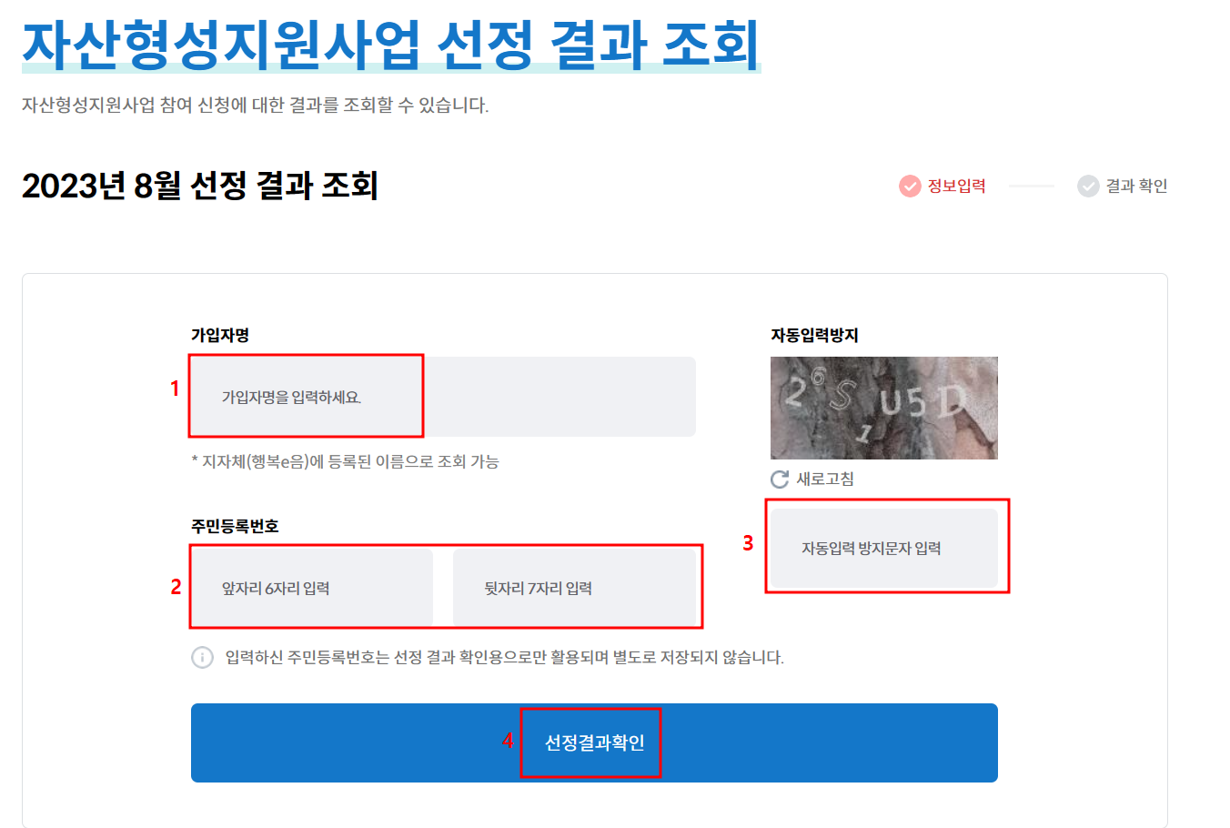 2. 개인정보 및 보안문자 입력 후 선정결과확인 클릭하기